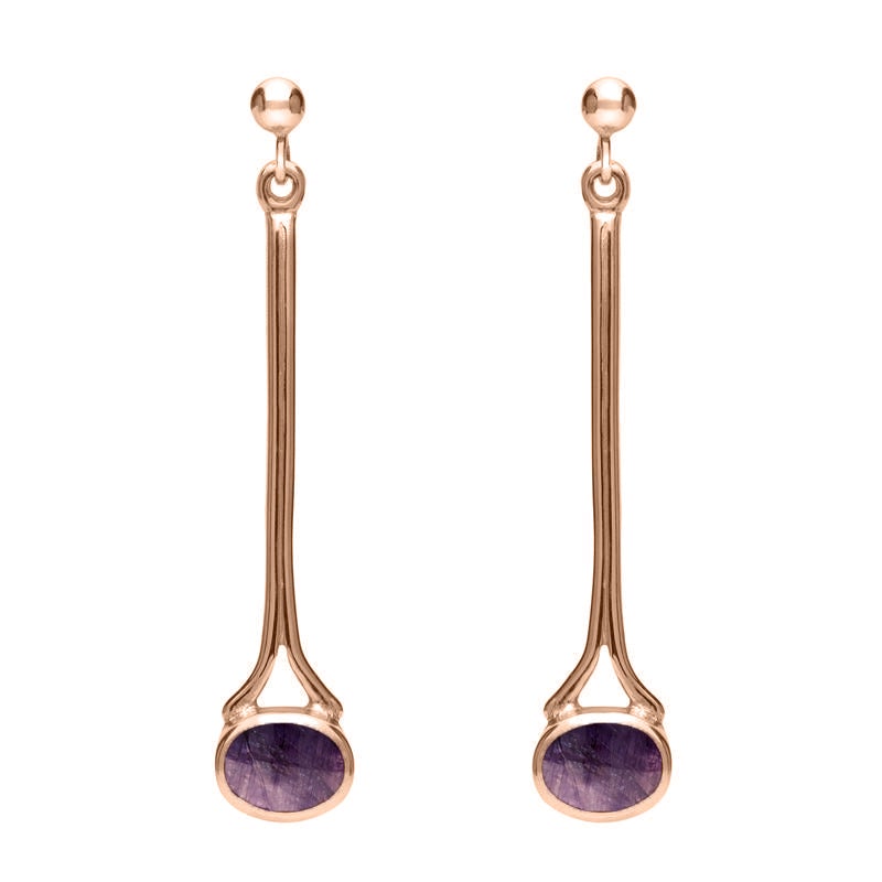 These elegant drop earrings feature two stunning Blue John gemstones which have been sourced locally from Castleton, Derbyshire. The hand carved cabochons are suspended in elongated 18ct rose gold frames creating an Art Nouveau feel. Completed with secure 18ct rose gold post and butterfly fittings.
