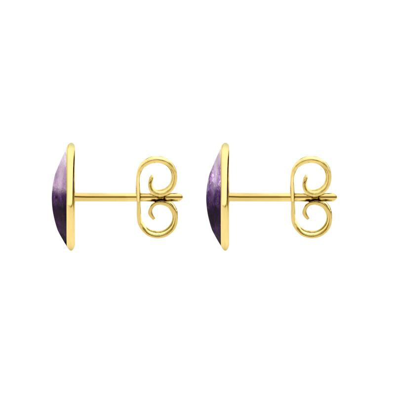 These classic earrings feature two oval shaped cabochons of the finest Blue John stone, sourced directly from the Peak Cavern in Derbyshire. The 9ct yellow gold frames are perfect for everyday wear and are secured with post and butterfly fastenings.