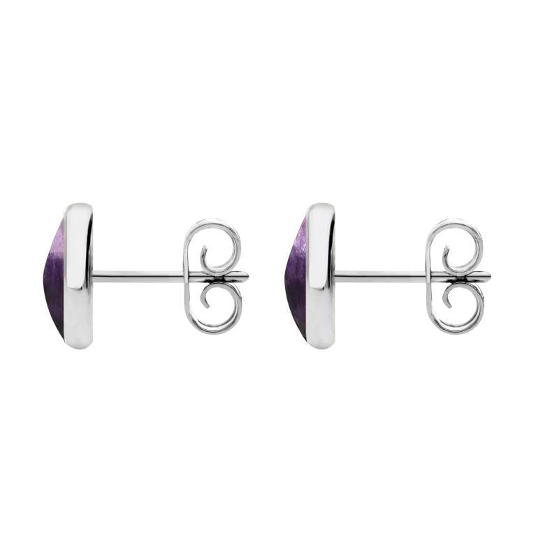 A staple piece for the jewellery box, these circular Derbyshire Blue John and sterling silver stud earrings are a perfect gift for someone who is just starting their jewellery collection. Beautifully discreet, these studs will match with a plethora of styles and occasions. Set with a secure post and butterfly fitting.