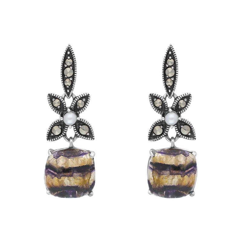 Sterling Silver Blue John Marcasite Pearl Flower Top Drop Earrings