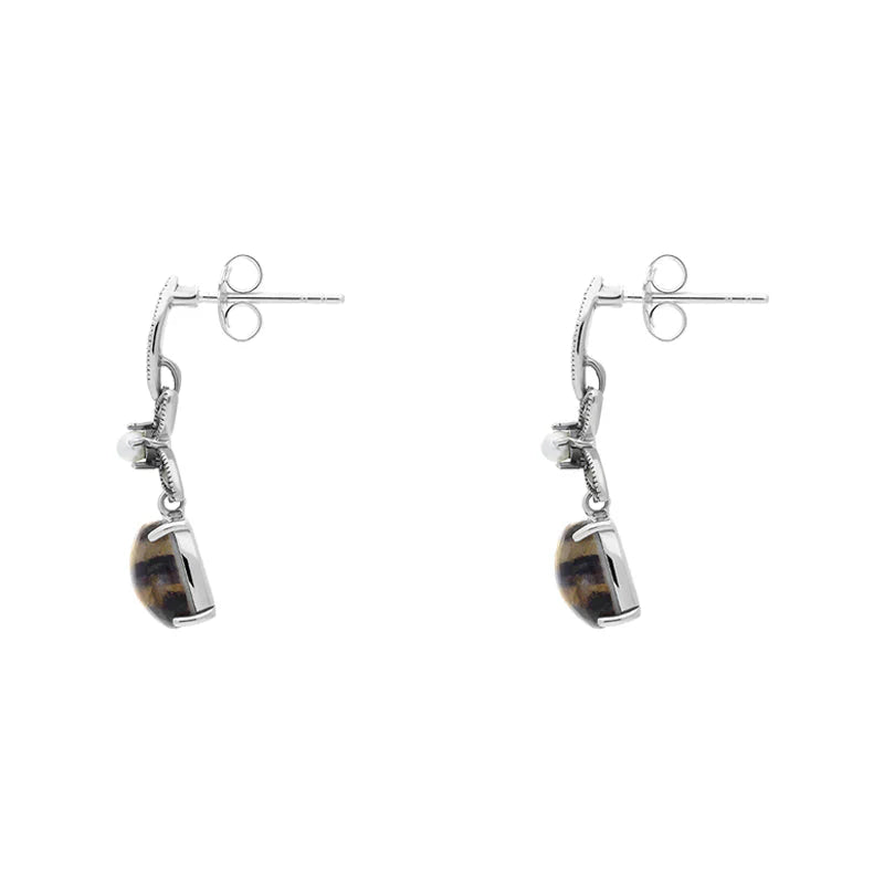 These charming earrings features the finest Blue John and Marcasite. The intricate design combines the Blue John and Marcasite with Pearl which creates a stunning contrast between sterling silver and makes the perfect earrings for someone looking for a beautifully unique piece.