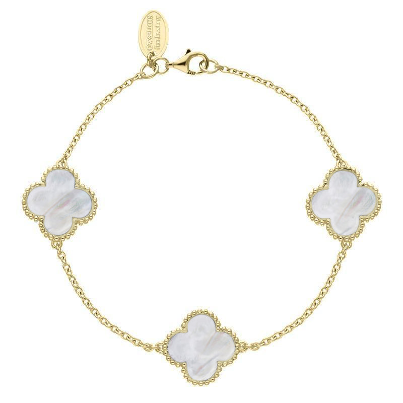 This elegant bracelet features three stunning four leaf clover shaped cabochons of the finest Mother of Pearl. The clover is surrounded with ball detail for a unique, stylish finish. The striking Mother of Pearl forms a stunning combination with the 18ct yellow gold 19cm chain, creating the perfect look for every occasion.