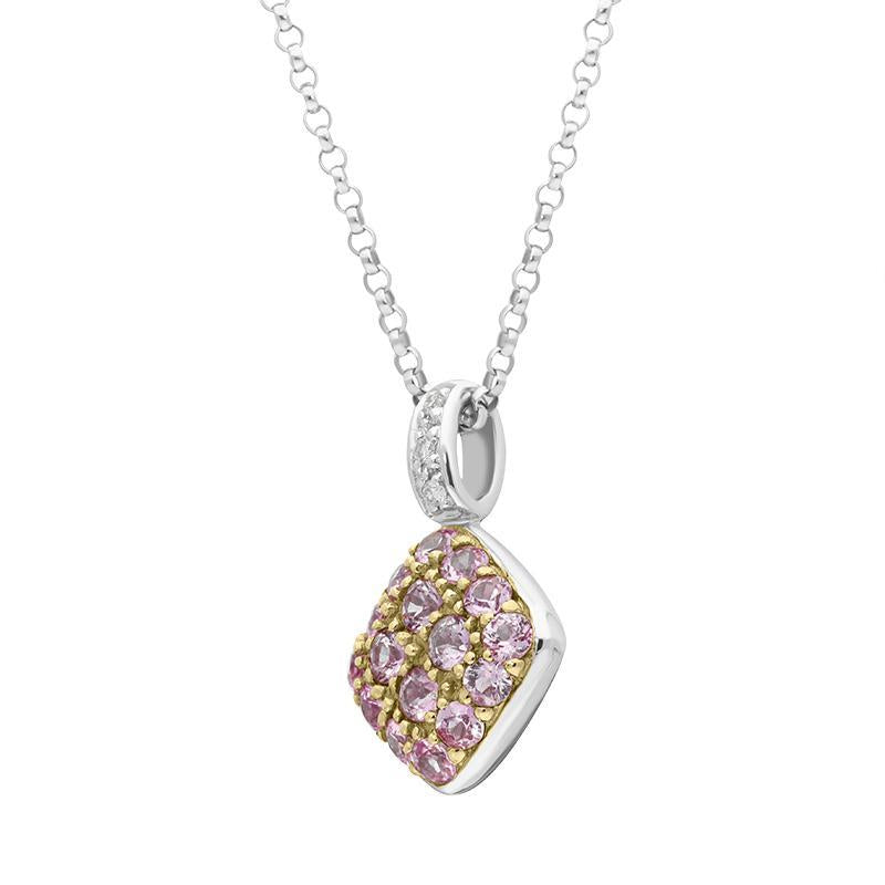 This feminine and elegant necklace is crafted in 18ct white gold with numerous stunning pink sapphires adorned into a diamond shape setting. Between the pink sapphires is yellow gold detailing, beautifully complementing the sapphires and creating a warm and feminine design. Complete with an 18ct white gold chain and a bail embellished with sparkling white diamonds, adding a touch of luxury.