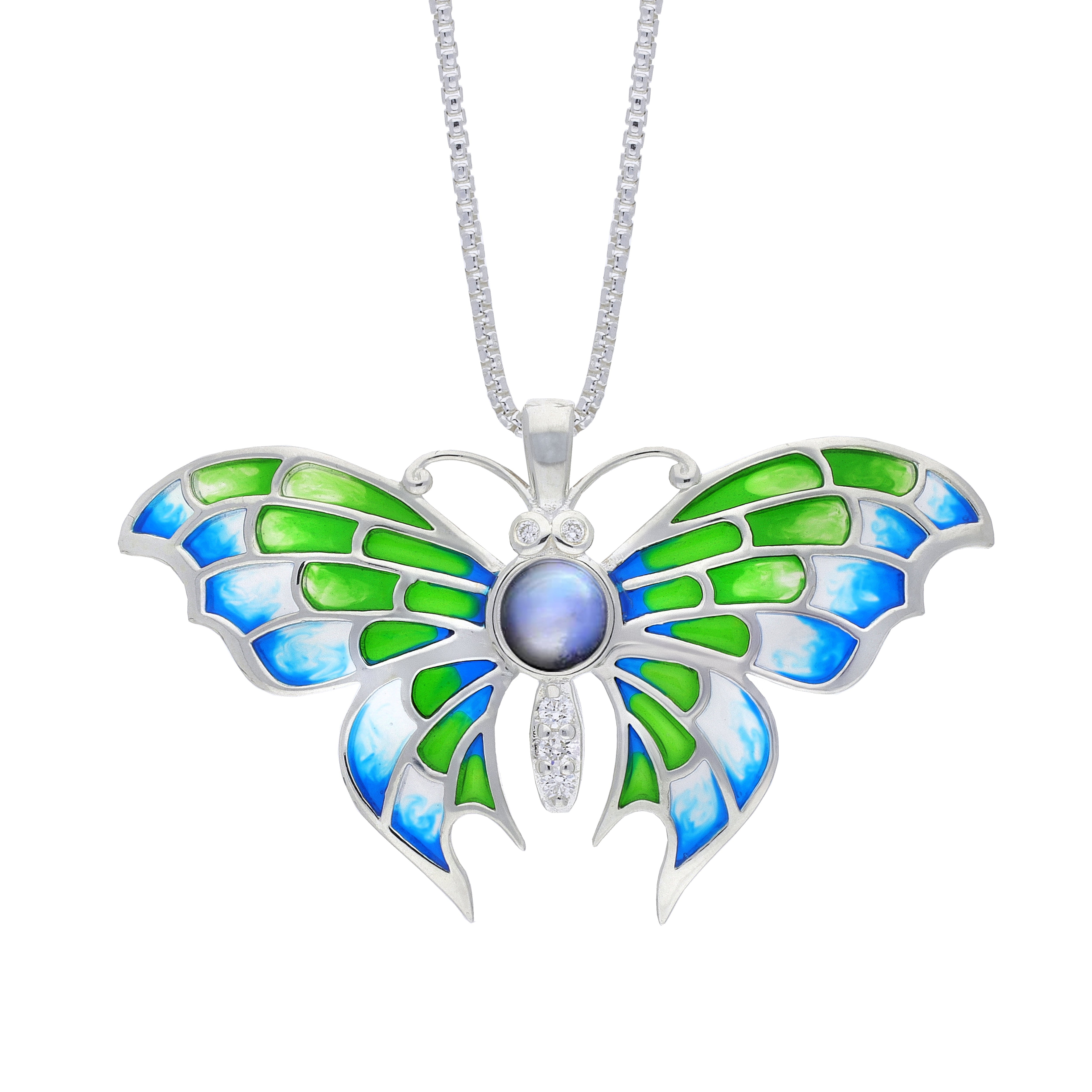 Sterling Silver Blue Green Enamel with Diamond & Blue Moonstone Butterfly Pendant
