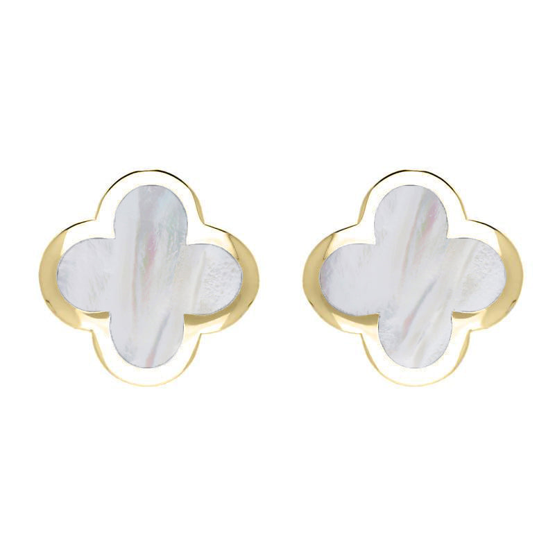 18ct Yellow Gold White Mother of Pearl Bloom Four Leaf Clover Stud Earrings, E2465