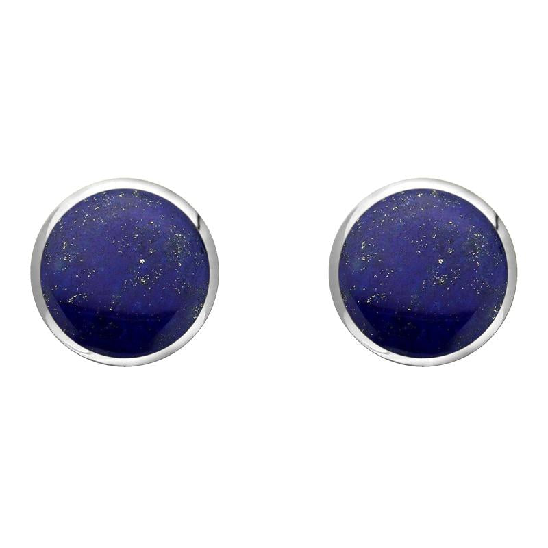 An embodiment of classic style, these sterling silver earrings feature two hand-carved circular cabochons of the finest Lapis Lazuli stone. The Lapis Lazuli is elegantly framed in sterling silver and the earrings are completed with secure post and butterfly fastenings, making them perfect for everyday wear.
