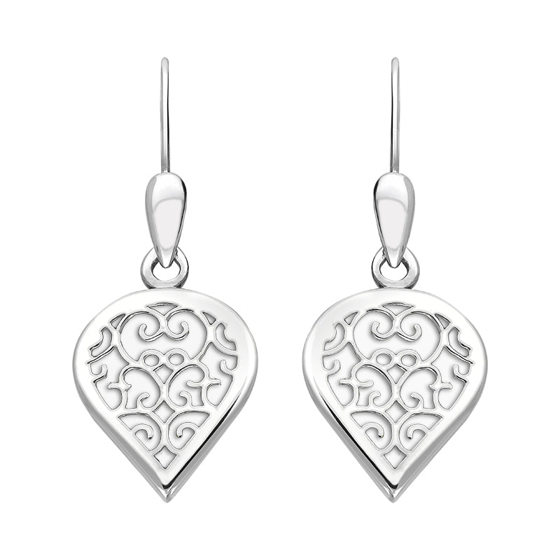 Sterling Silver Bauxite Flore Filigree Heart Drop Earrings. E2588.
