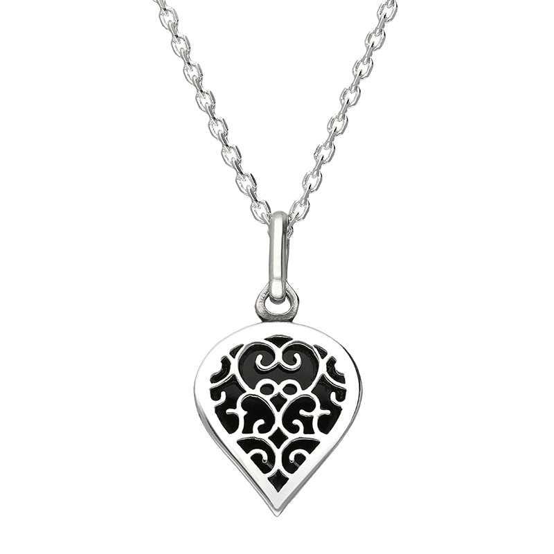 • Sterling Silver Whitby Jet Flore Filigree Small Heart Necklace - P3629 (FLR-001)