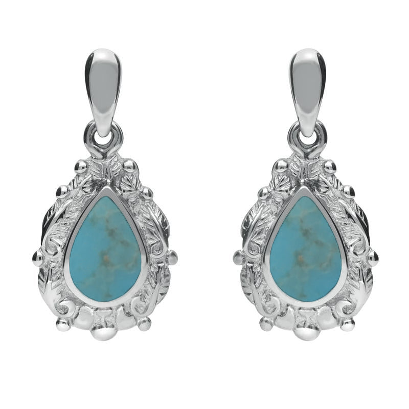 These exquisite 9ct White gold earrings feature two stunning pear shaped cabochons of the finest Turquoise stone, sourced directly from the famous Kingman Mine in Arizona. The beautiful 9ct White gold frames feature an ornate leaf decoration around the edging, creating this unique design. The earrings are completed with post and butterfly fastenings, for secure everyday wear.