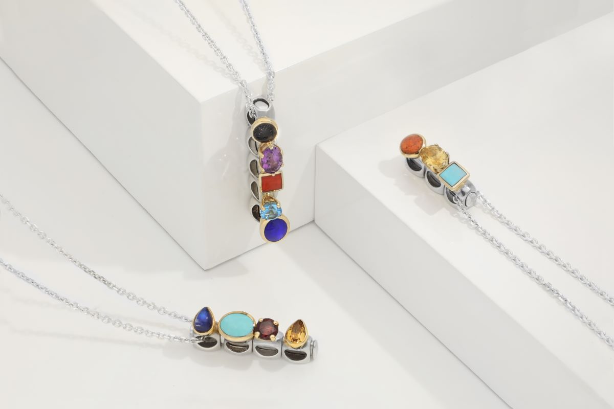 With both smooth and faceted gemstones available in a selection of design shapes, Stepping Stones offer elegant individuality with unlimited and personal design combinations. All the charms can be stacked onto a silver stem pendant, and rings neatly fit together. A range of matching single gemstone drop and stud earrings are also available in the collection to complement each ring and pendant design.