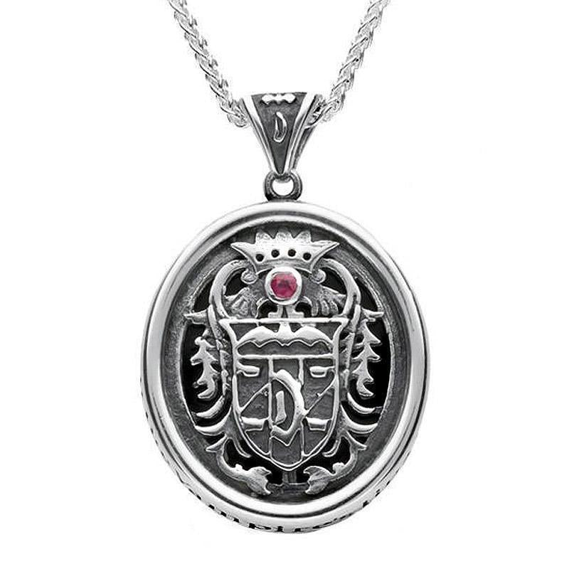 This stunning 18ct white gold pendant encloses an oval Whitby Jet gemstone and 'Blood Red' Ruby beneath the family crest, held within an oval frame which is engraved with an extract from the original 'Dracula' novel by Bram Stoker. Supplied complete with an 18 inch 18ct white gold chain.