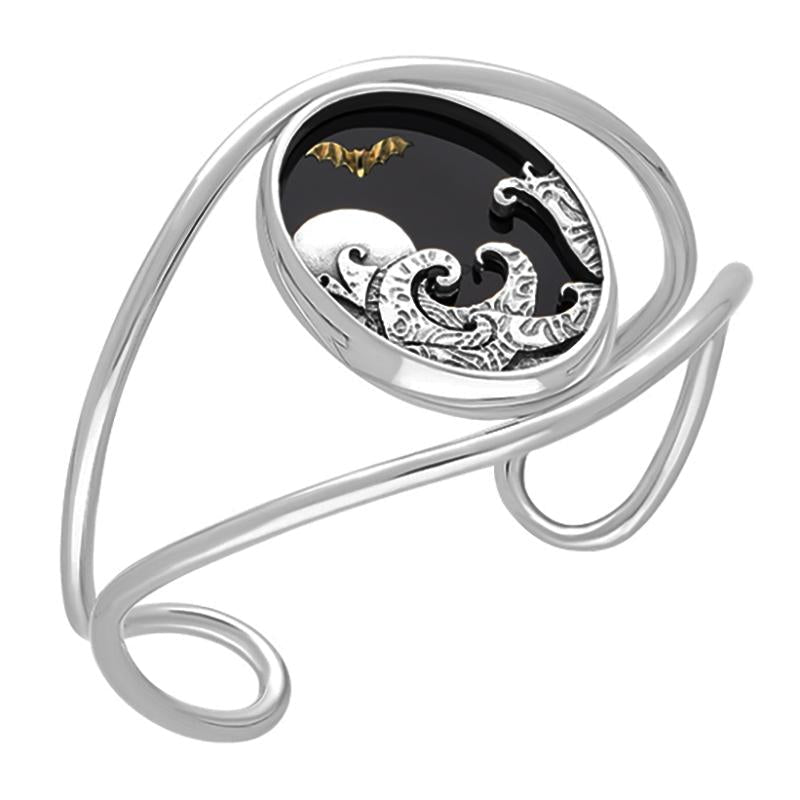 Sterling Silver 9ct Yellow Gold Whitby Jet Moon Wave Bat Cuff Bangle