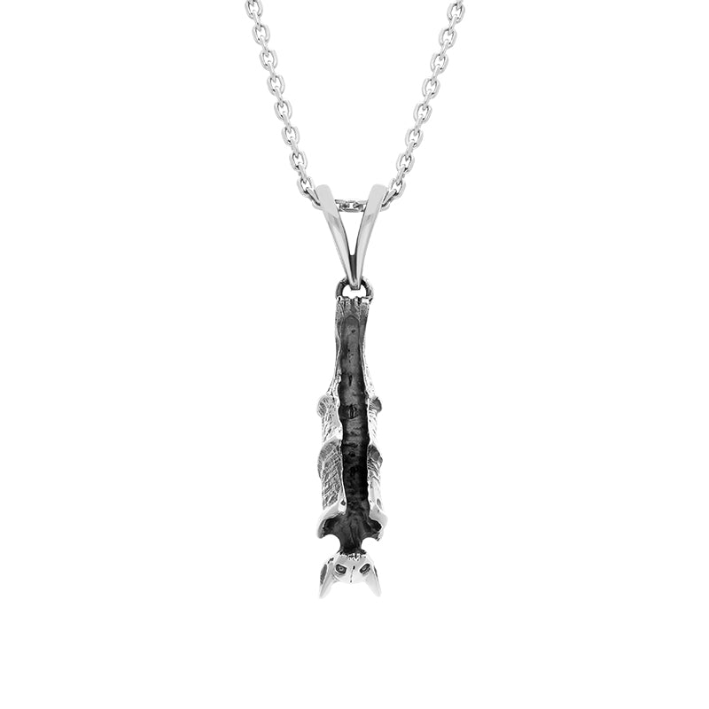 A stunning new design fashioned in sterling silver featuring a spooky upside down hanging bat design and presented on an 18inch sterling silver chain. This necklace is the perfect accessory or gift for any collector of gothic jewellery or memorabilia.