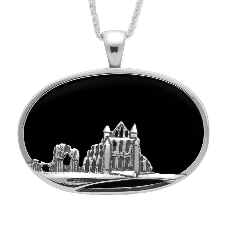 This exquisite necklace features a stunning oval shaped cabochon of the finest Whitby Jet stone, sourced directly from the North East coast of Yorkshire. The beautiful sterling silver frame represents the unique origin of Whitby Jet featuring an intricate handcrafted Whitby Abbey bringing the ancient ruin to life. The Abbey is a perfect symbol for Whitby as it dominates the skyline of the small fishing town. The pendant hangs gracefully from a fluid 18 inch long sterling silver chain complete with a classic bolt ring clasp for easy wear.