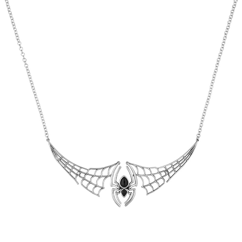 This sinister necklace is handcrafted into a chilling spider design as part of our Gothic collection. The haunting sterling silver spider features the finest Whitby Jet stone, sourced directly from the North East coast of Yorkshire. The statement necklace is inspired by many Gothic events held in Whitby throughout the year. The exclusive pendant hangs from an intricate spiders web on a fluid 18 inch long sterling silver chain complete with a classic bolt ring clasp for easy wear.