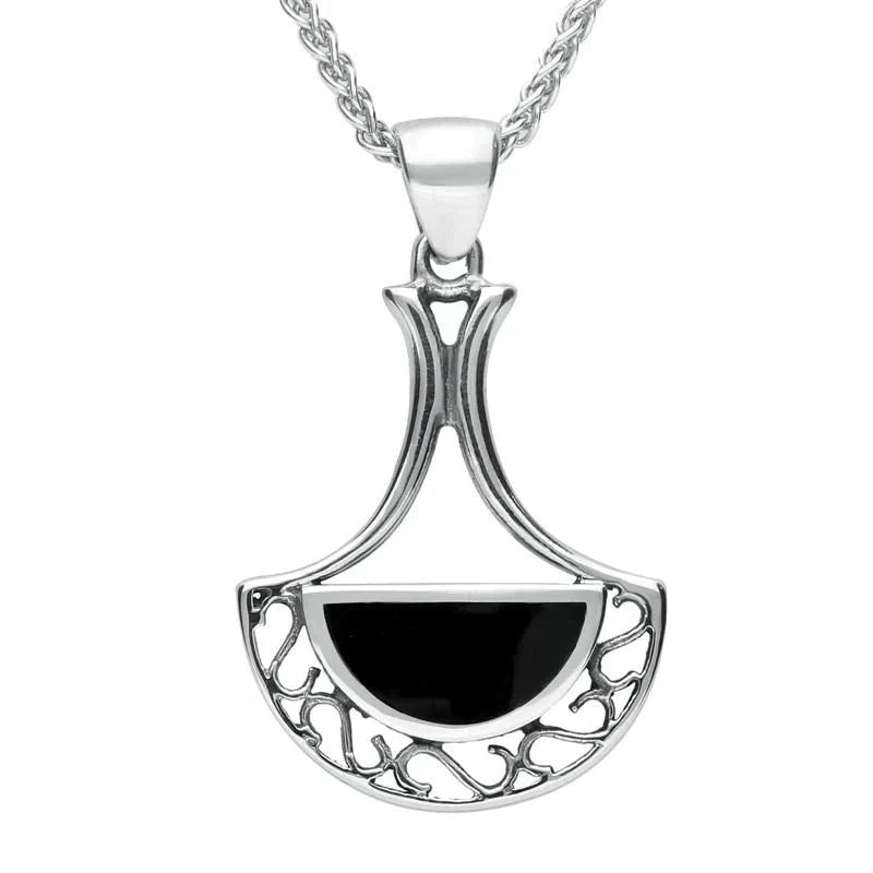 This sterling silver and Whitby Jet pendant is presented in the form of a stylised fan. Inspired by Art Deco design, the scrolling detail along the curved edge is evocative of delicate lace. Presented on an 18 inch silver chain, the necklace is suitable to wear on any occasion.