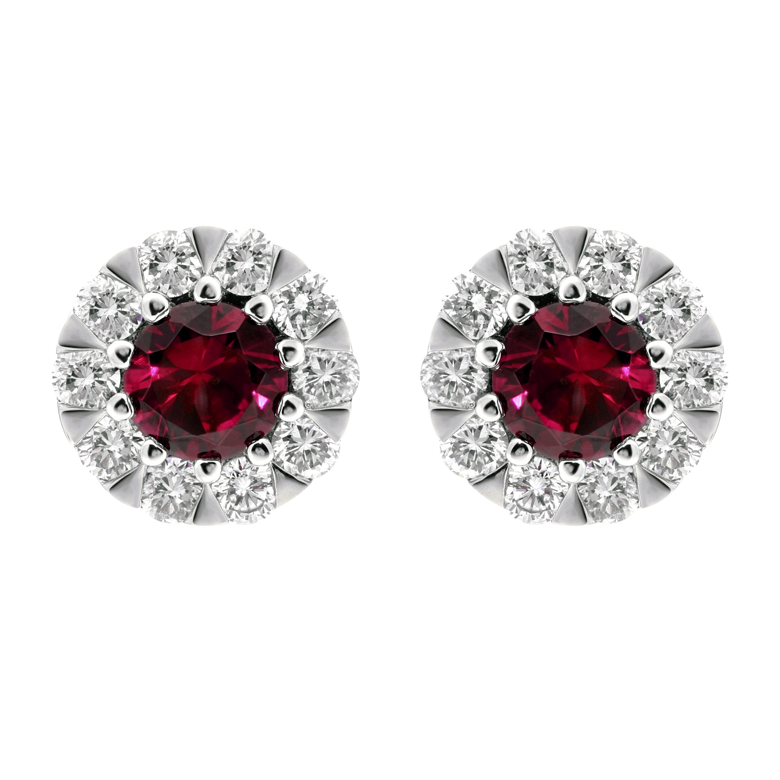 Simple and elegant, these cluster stud earrings feature sparkling rubies totalling 0.40cts, with a halo of brilliant cut diamonds totalling 0.26cts. Beautifully crafted in 18ct white gold with secure post and butterfly fastenings.