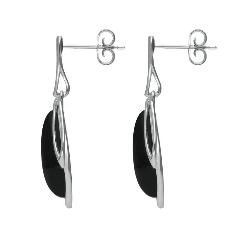 These contemporary earrings feature a central hand carved marquise shaped Whitby Jet gemstones, sourced directly from the North East coast of Yorkshire, highly polished and set in 18ct White Gold. Open work detail at the side of the Whitby Jet is a lovely enhancement to the earrings. Secured with a post and butterfly back fastening.