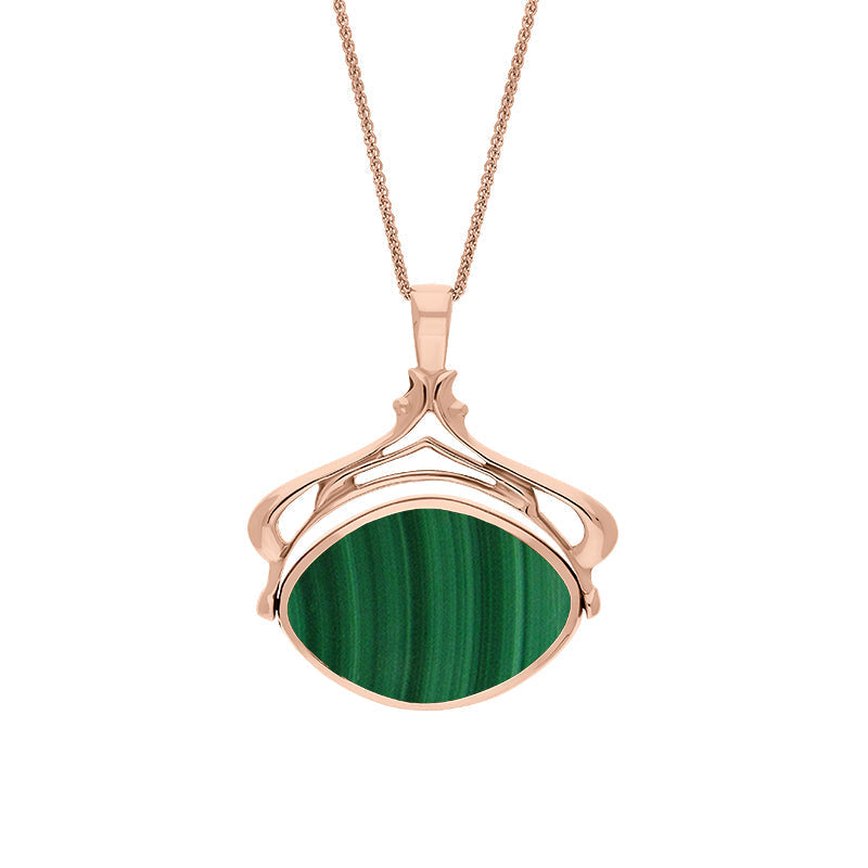 9ct Rose Gold Whitby Jet Malachite Marquise Swivel Fob Necklace, P115_10.