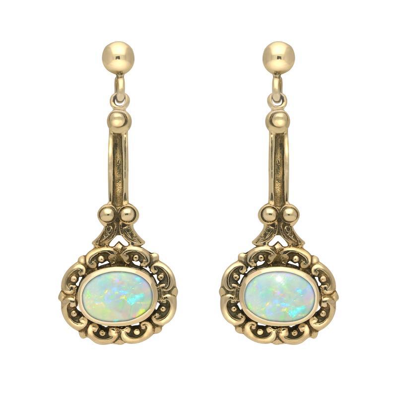 A gorgeous pair of drop earrings, each with an oval drop shaped Opal gemstone held at the bottom of an ornate 9ct yellow gold drop design. Fastened with a secure post and scroll fitting, the earrings complete any outfit.