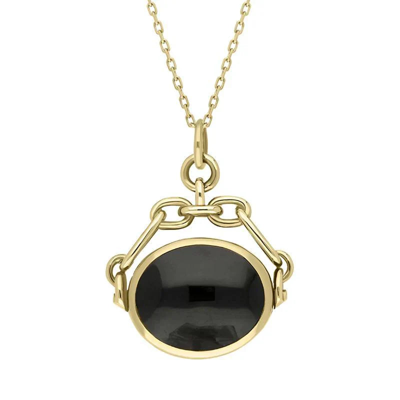 9ct Yellow Gold Whitby Jet Amber Double Sided Swivel Fob Necklace, P209.