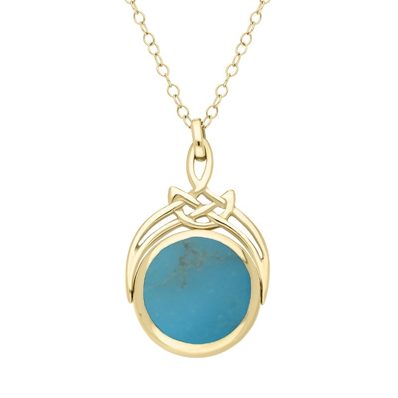 This stunning double sided pendant features the finest Whitby Jet and Turquoise gemstones set in an eye catching 9ct yellow gold design. Hand carved to a round shape, the clean cut edges and mirror like shine make this pendant contemporary and unique. Presented on an 18 inch 9ct yellow gold chain through a fixed bail at the top.