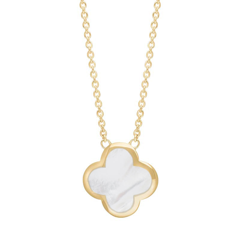 9ct Yellow Gold White Mother of Pearl Bloom Large Four Leaf Clover Polished Edge Pendant, N1153