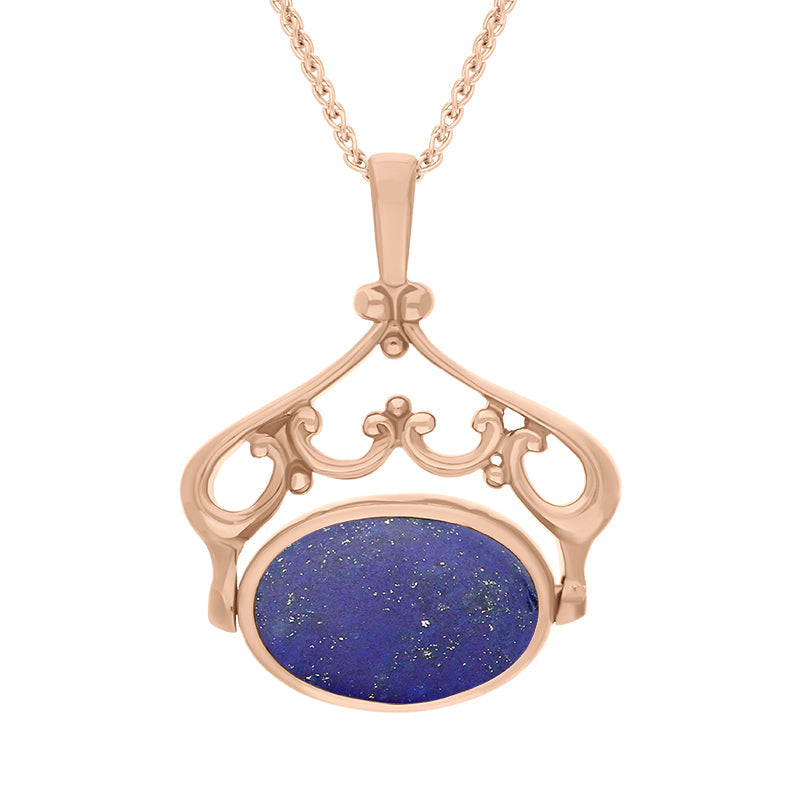 18ct Rose Gold Whitby Jet Lapis Lazuli Ornate Double Sided Oval Swivel Fob Necklace, P116_8.