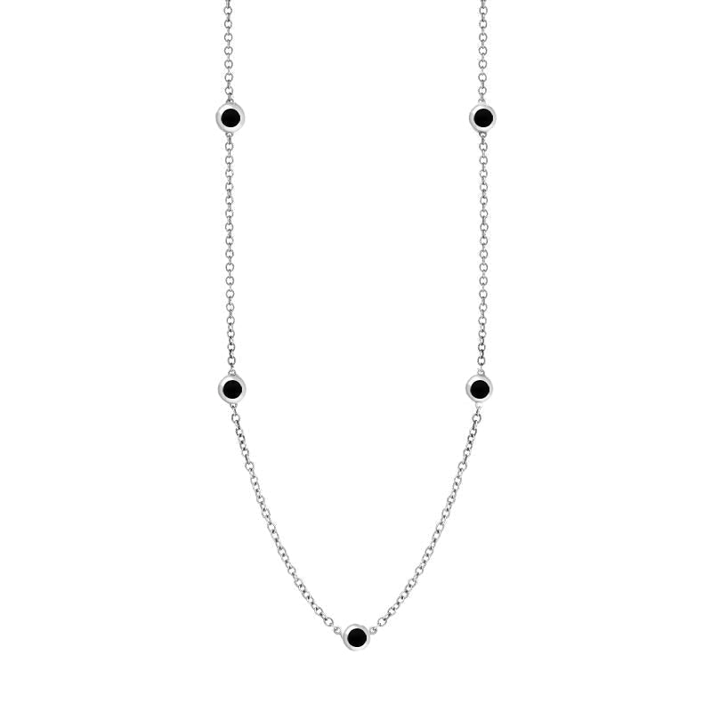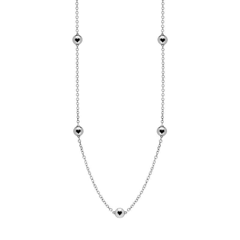 This on trend 18ct white gold chain necklace features petite discs embellished with heart shaped fine Whitby Jet stones that have been sourced directly from the North East coast of Yorkshire.