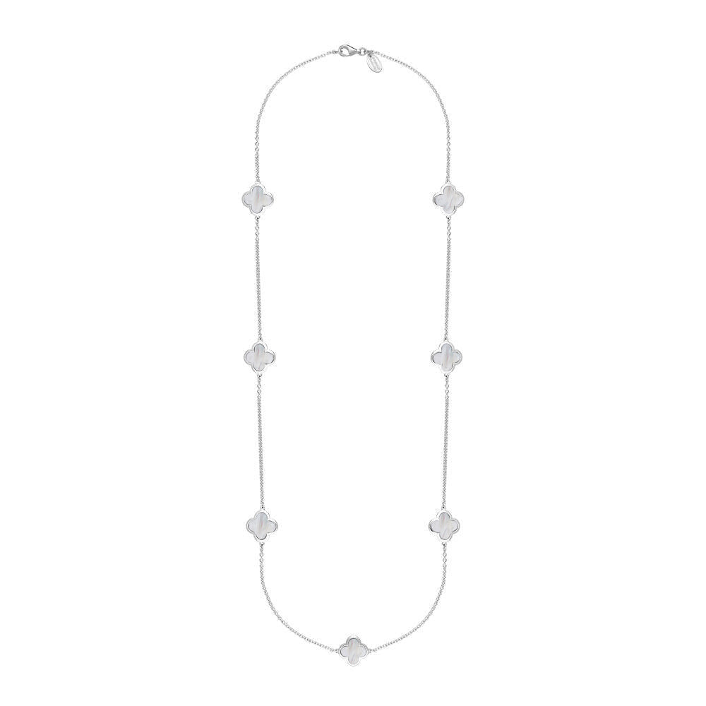 18ct White Gold White Mother of Pearl Bloom Four Leaf Clover Long Necklace