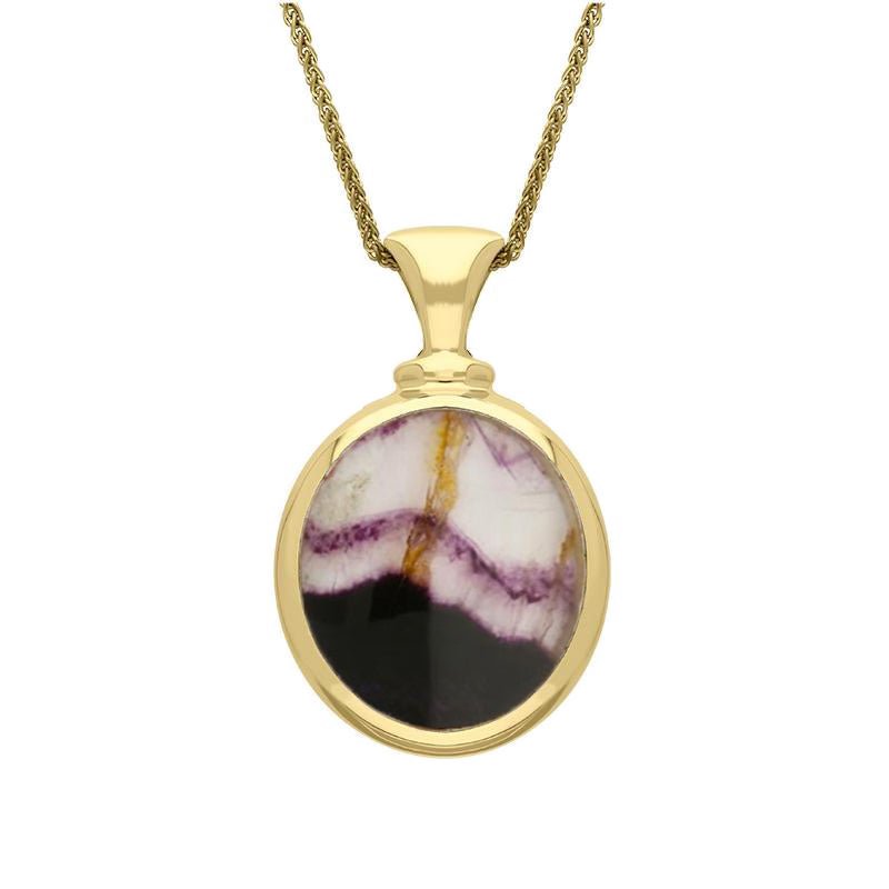 This beautiful double sided fob style necklace features the finest Blue John and White Mother Of Pearl. The hand carved gemstones are flush set into the organic, contemporary oval shape giving a smooth and highly polished finish. Sold complete with an 18 inch 18ct yellow gold chain which fastens with a classic bolt ring style clasp. Dimensions: 18mm x 15mm.