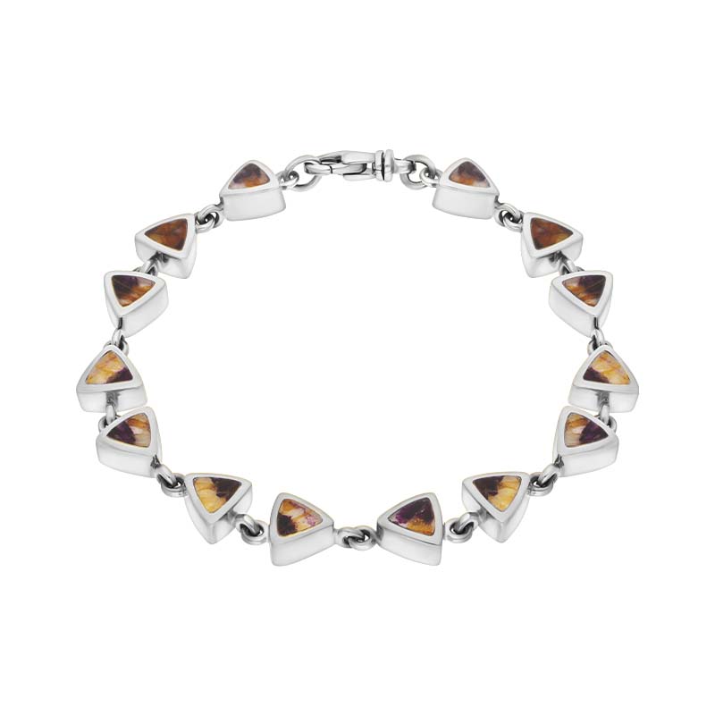 This statement bracelet features 14 curved triangle shaped highly polished Blue John gemstones which are set in 9ct White Gold. The bracelet is secured by a solid lobster clasp fastening.