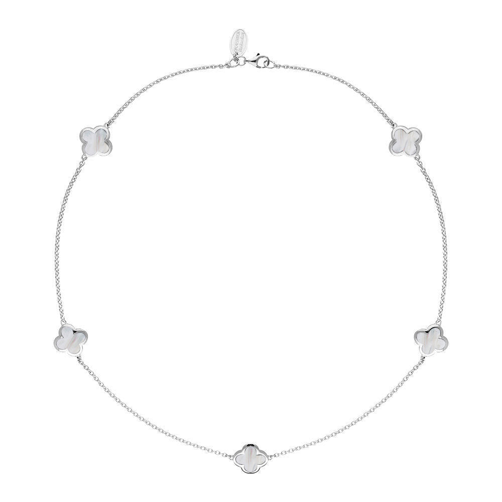 This elegant necklace features five stunning four leaf clover shaped cabochons of the finest Mother of Pearl. The clover is surrounded with a smooth edge detail for a sleek finish. The striking Mother of Pearl forms a stunning combination with the 9ct white gold as the clover hangs gracefully along a 77cm chain, the perfect look for every occasion.