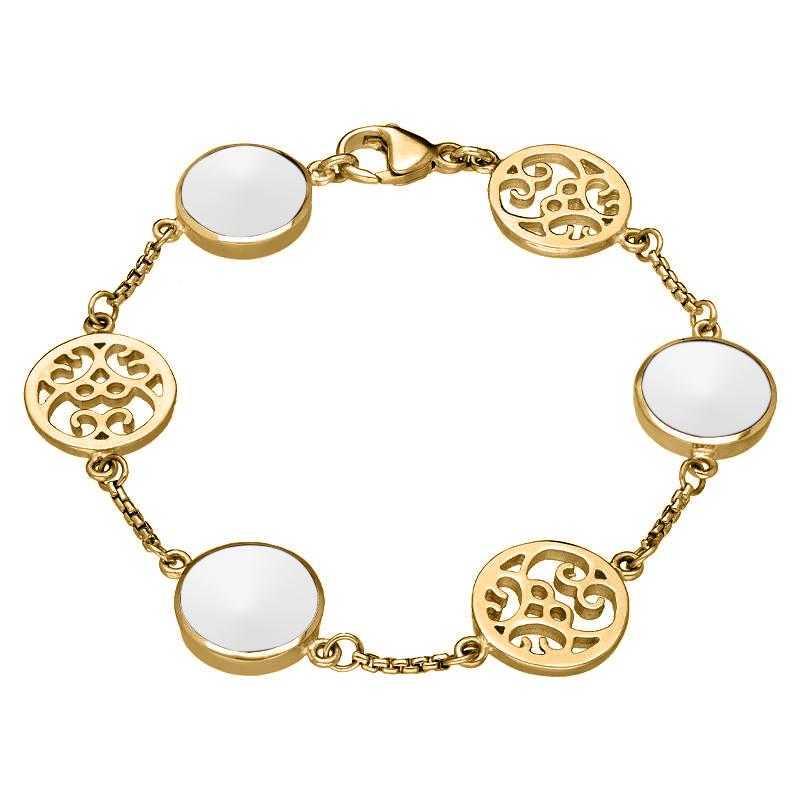 This elegant bracelet is part of Rebecca Sellors' Flore collection. The design features hand carved and polished cabochons of fine white Bauxite stone. Crafted in 9ct yellow gold, the bracelet also features the signature Flore filigree patterning. Completed with a secure lobster clasp.