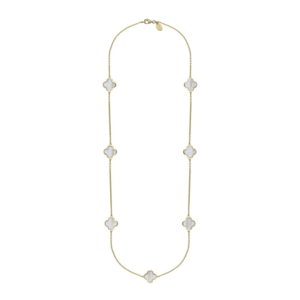 9ct Yellow Gold White Mother of Pearl Bloom Four Leaf Clover Long Necklace