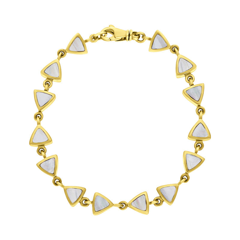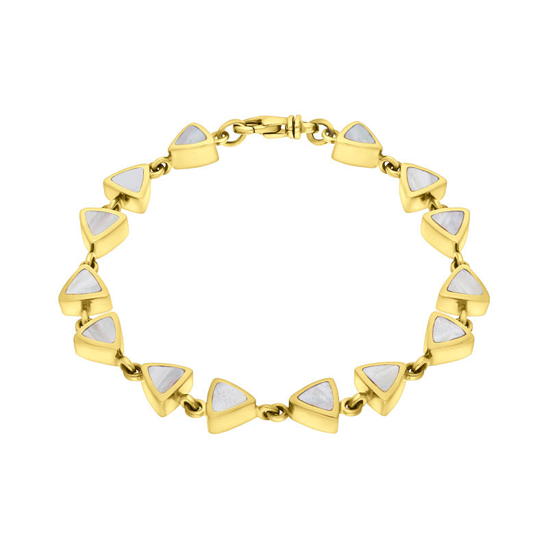 This statement bracelet features 14 curved triangle shaped highly polished White Mother of Pearl gemstones which are set in 9ct Yellow Gold. The bracelet is secured by a solid lobster clasp fastening.