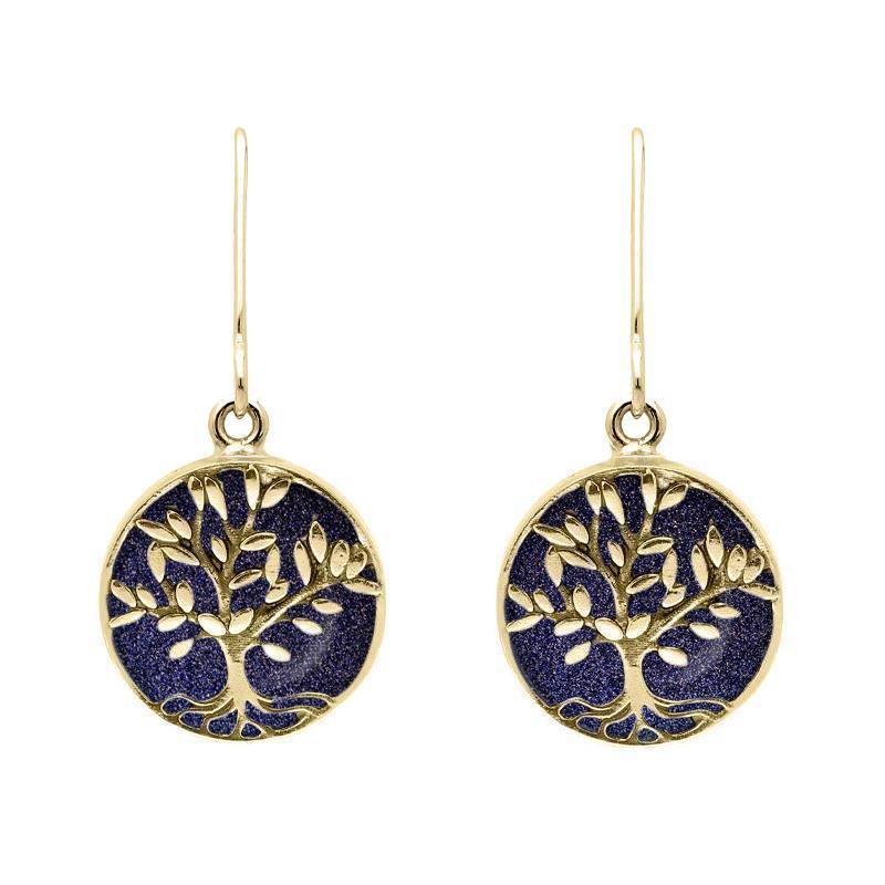 9ct Yellow Gold Blue Goldstone Round Large Tree of Life Leaves Drop Earrings, E2427