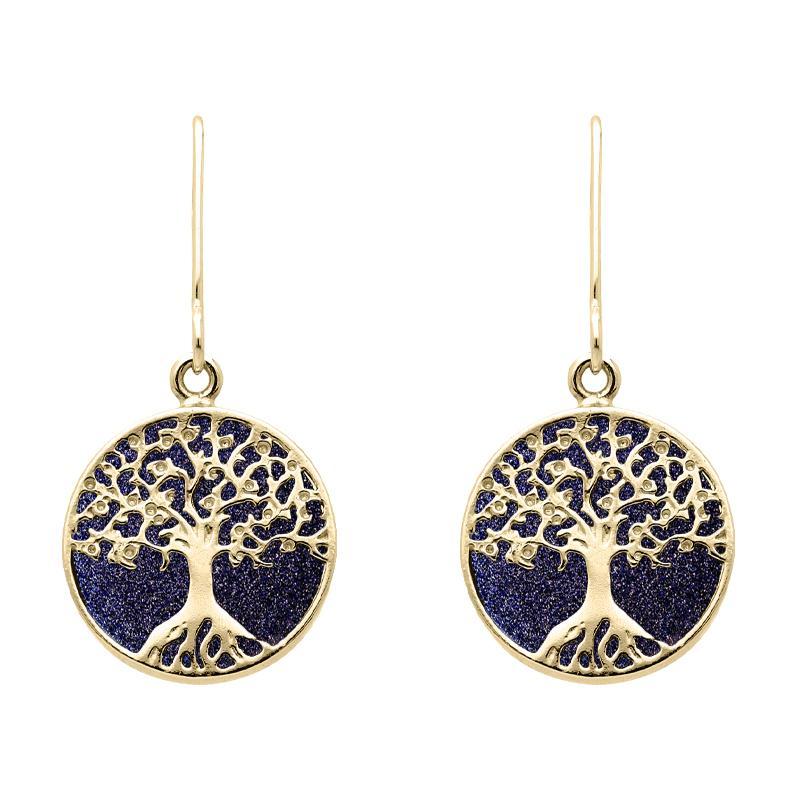 9ct Yellow Gold Blue Goldstone Round Tree of Life Drop Earrings, E2429.