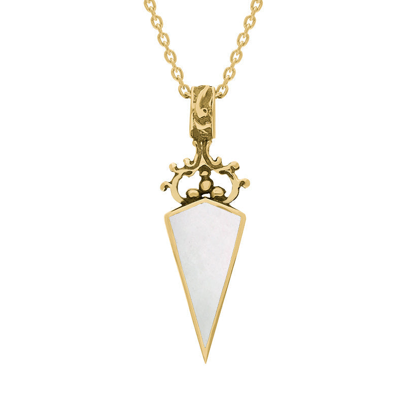 9ct Yellow Gold Blue John White Mother Of Pearl Double Sided Scroll Top Dagger Fob Necklace, P423.