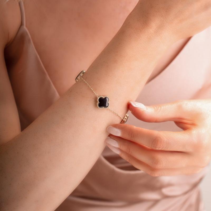 This elegant bracelet features three stunning four leaf clover shaped cabochons of the finest Whitby Jet stone, sourced directly from the north east coast of Yorkshire. The clover is surrounded with ball detail for a unique, stylish finish. The striking Whitby Jet forms a stunning contrast between the 9ct yellow gold 19cm chain, creating the perfect look for every occasion.