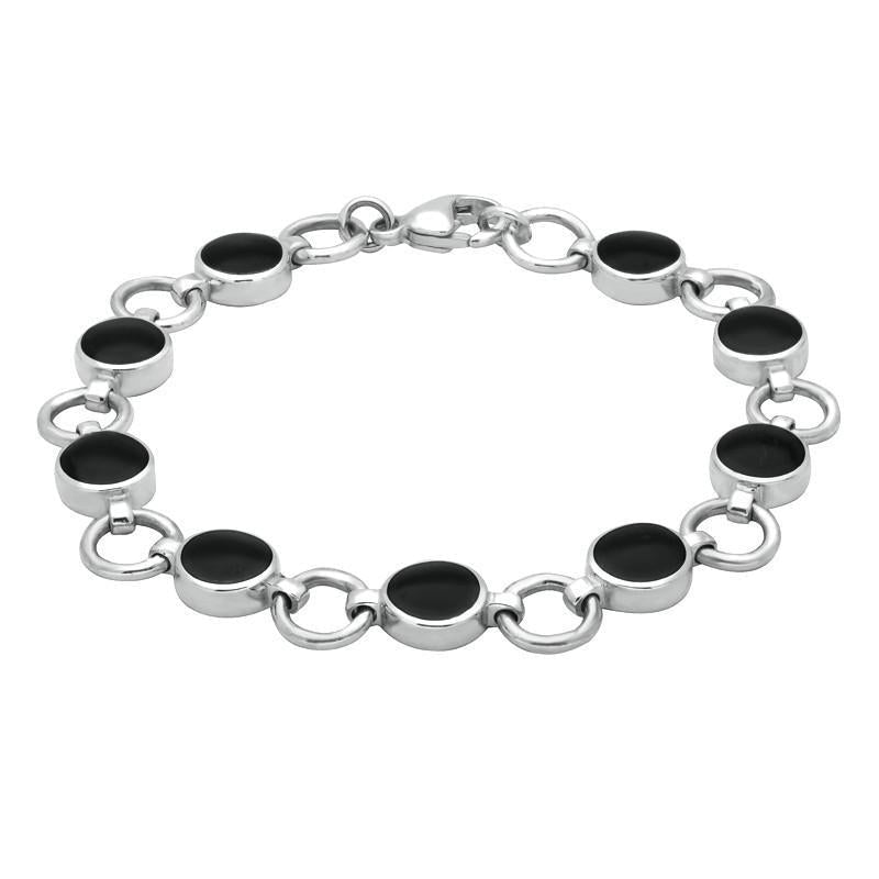 This stunning bracelet features nine cabochons of the finest Whitby Jet stone, sourced directly from the North East coast of Yorkshire. The highly polished gemstones are set between handcrafted solid sterling silver ring links. Completed with a secure sterling silver lobster clasp. A beautiful, eye-catching addition to any jewellery lover's collection.