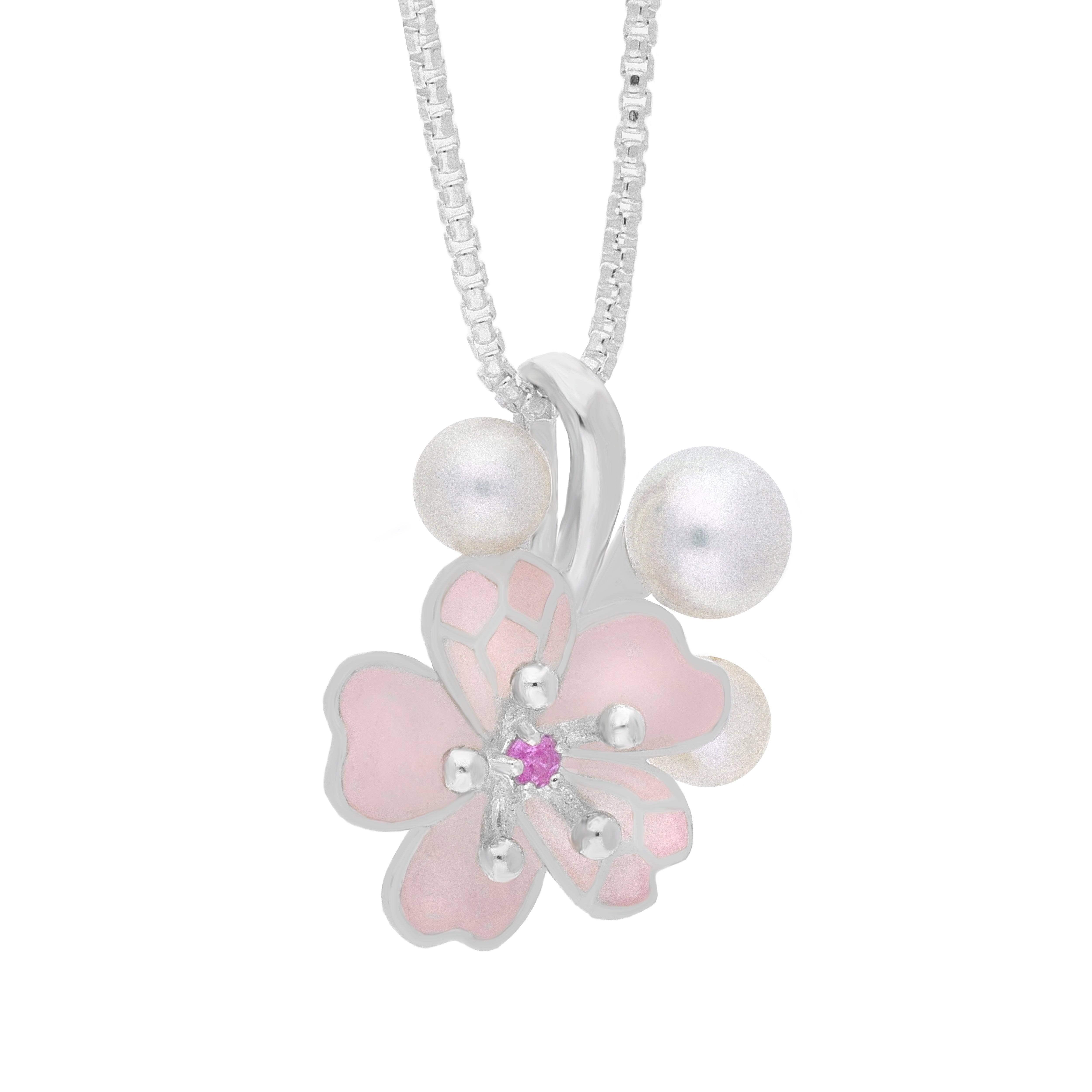 Sterling Silver Pearl and Pink Sapphire Cherry Blossom Flower Pendant