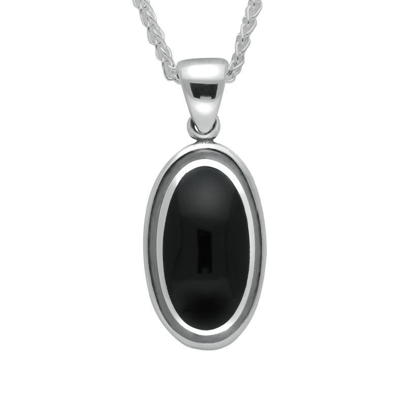 This classic necklace features a stunning oval shaped cabochon of the finest Whitby Jet stone, sourced directly from the north east coast of Yorkshire. The beautiful sterling silver ridged pendant hangs gracefully from a fluid 18 inch long silver chain complete with a classic bolt ring clasp for easy wear.