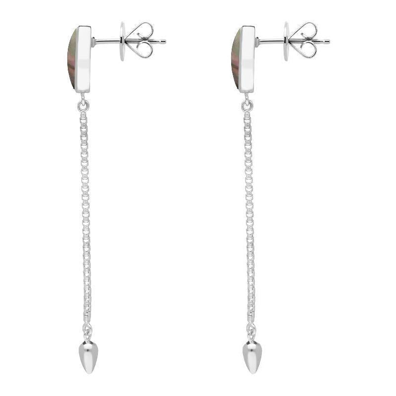 With minimalist design and a distinct architectural edge, these elegant long drop stud earrings feature 10mm long, hand cut Dark Mother Of Pearl shell framed in contemporary sterling silver settings. Fluid 35mm long chains flow from beneath the stones and they are finished with teardrop shaped sterling silver beads. The earrings are completed with classic post and butterfly studs.