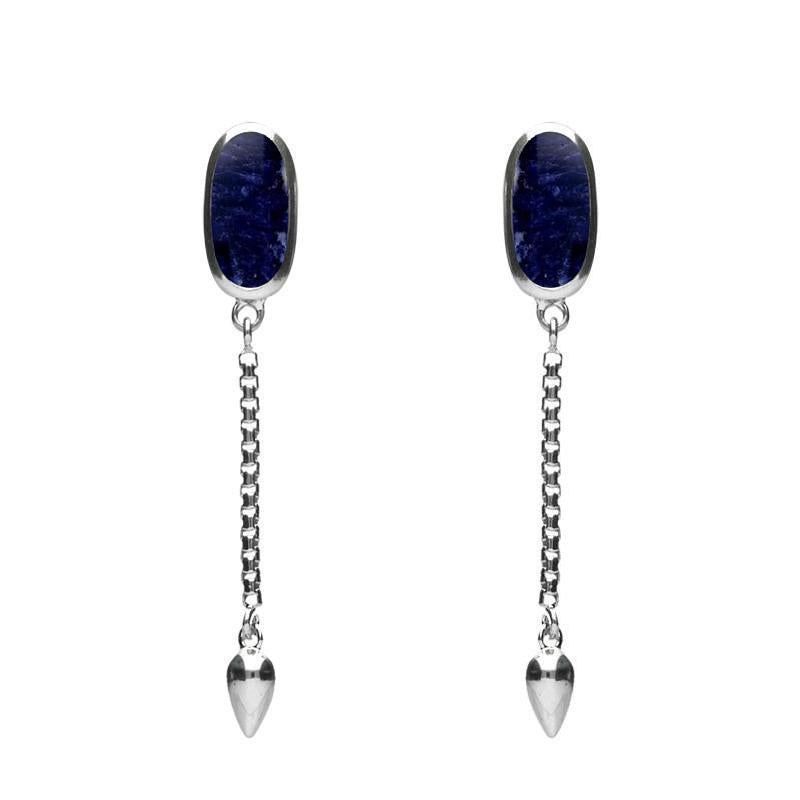 These elegant long drop stud earrings feature long, hand cut oval Sodalite gemstones framed in contemporary sterling silver settings. Fluid 20mm long chains flow from beneath the stones and they are finished with teardrop shaped sterling silver beads. The earrings are completed with classic post and butterfly studs.