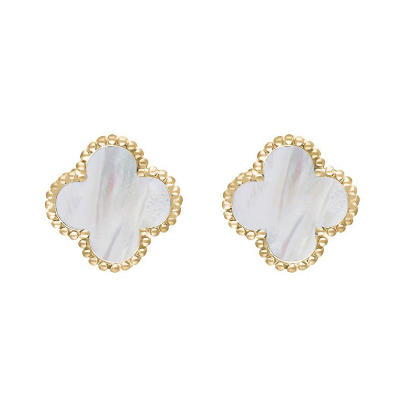 9ct Yellow Gold White Mother of Pearl Bloom Four Leaf Clover Ball Edge Stud Earrings, E2600