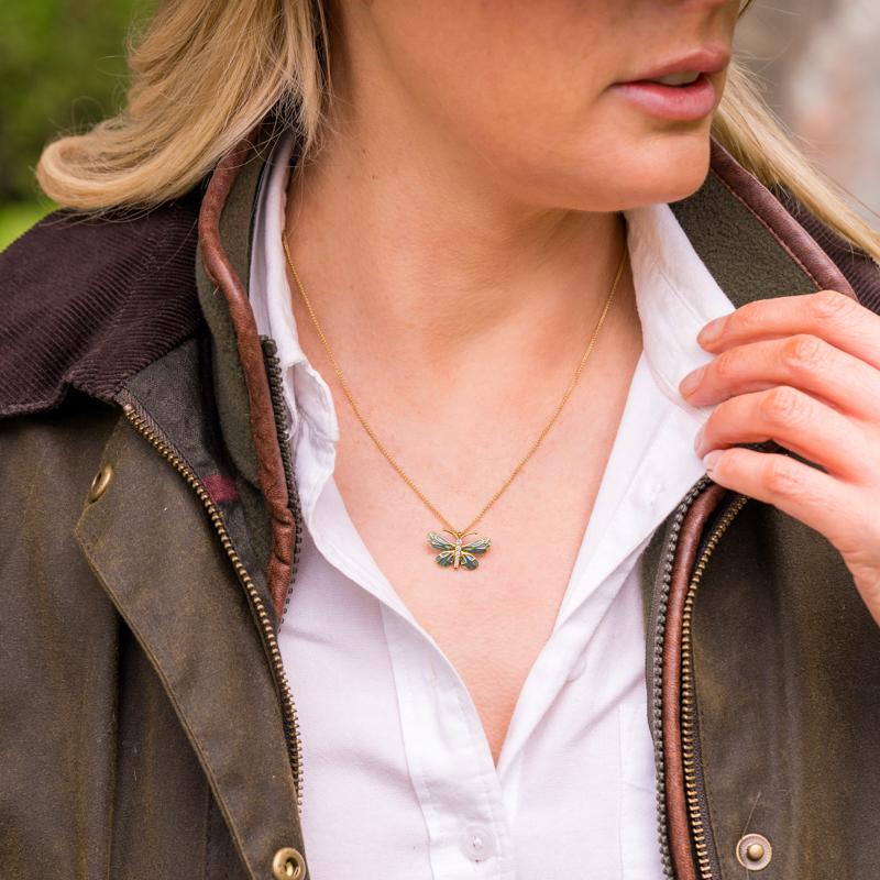 The embodiment of luxury, this pendant is fashioned from the finest 18ct Yellow Gold and embellished with sparkling Diamonds. It is sold complete with an 18 inch long 18ct Yellow Gold chain. The blue wings are vitreous enamelled in the Plique-a-Jour style. Plique a Jour is a highly specialised enamelling technique and provides vibrant colour to many of the insect designs. Working like a miniature version of stained-glass, powdered glass is placed in cells and heated. Unlike cloisonné work the cells are open which allows the light to shine through the transparent or translucent enamel. Completed with post and butterfly fastenings for secure and easy wear.