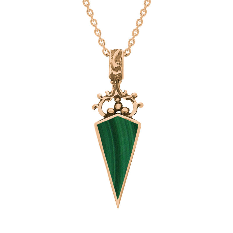 This classic double sided fob necklace is part of our Heritage handmade jewellery collection and features a dagger shaped locally sourced Whitby Jet gemstone on one side and a Malachite gemstone on the other. The stones are framed within a heavy highly polished 9ct Rose Gold setting with a scroll shaped bail. This item is complete with an 18 inch Rose Gold chain.