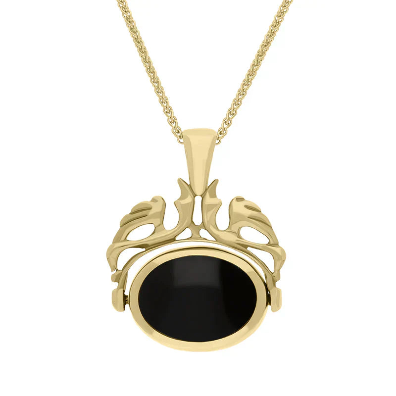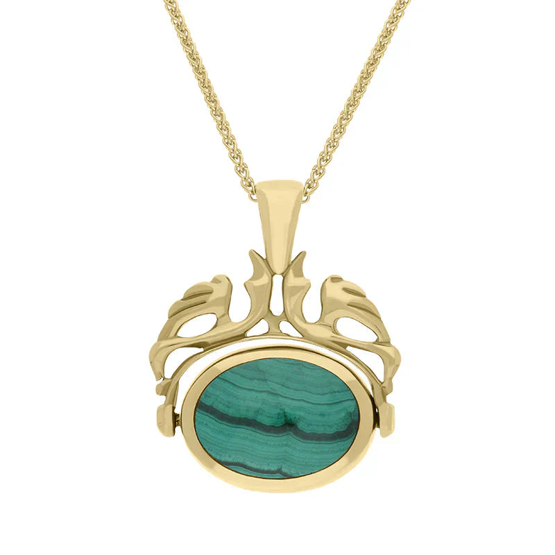 9ct Yellow Gold Whitby Jet Malachite Double Sided Oval Swivel Fob Necklace, P104_4.