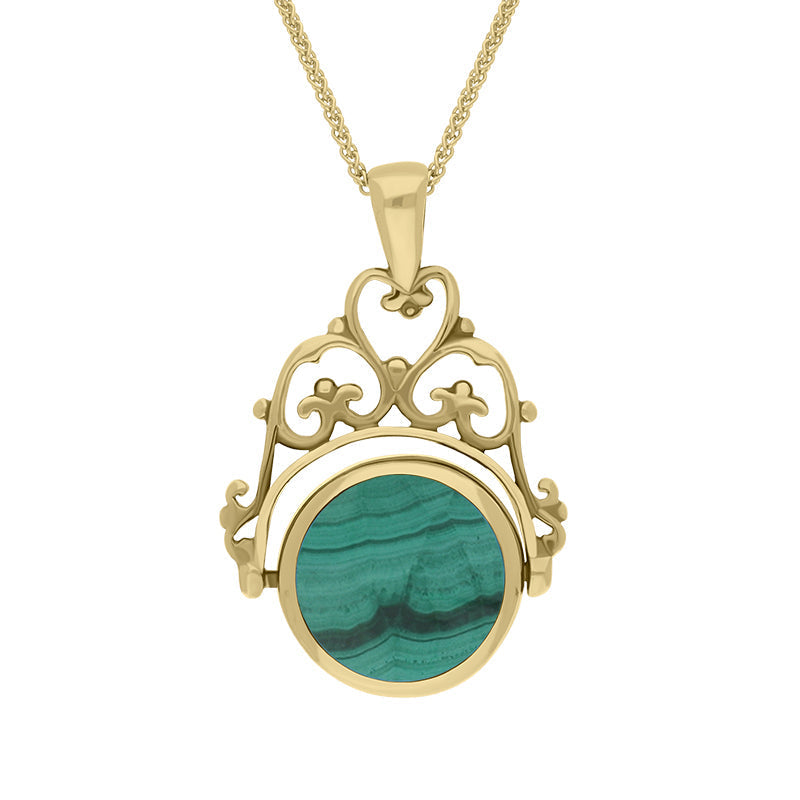 9ct Yellow Gold Whitby Jet Malachite Double Sided Round Swivel Fob Necklace, P110_2.